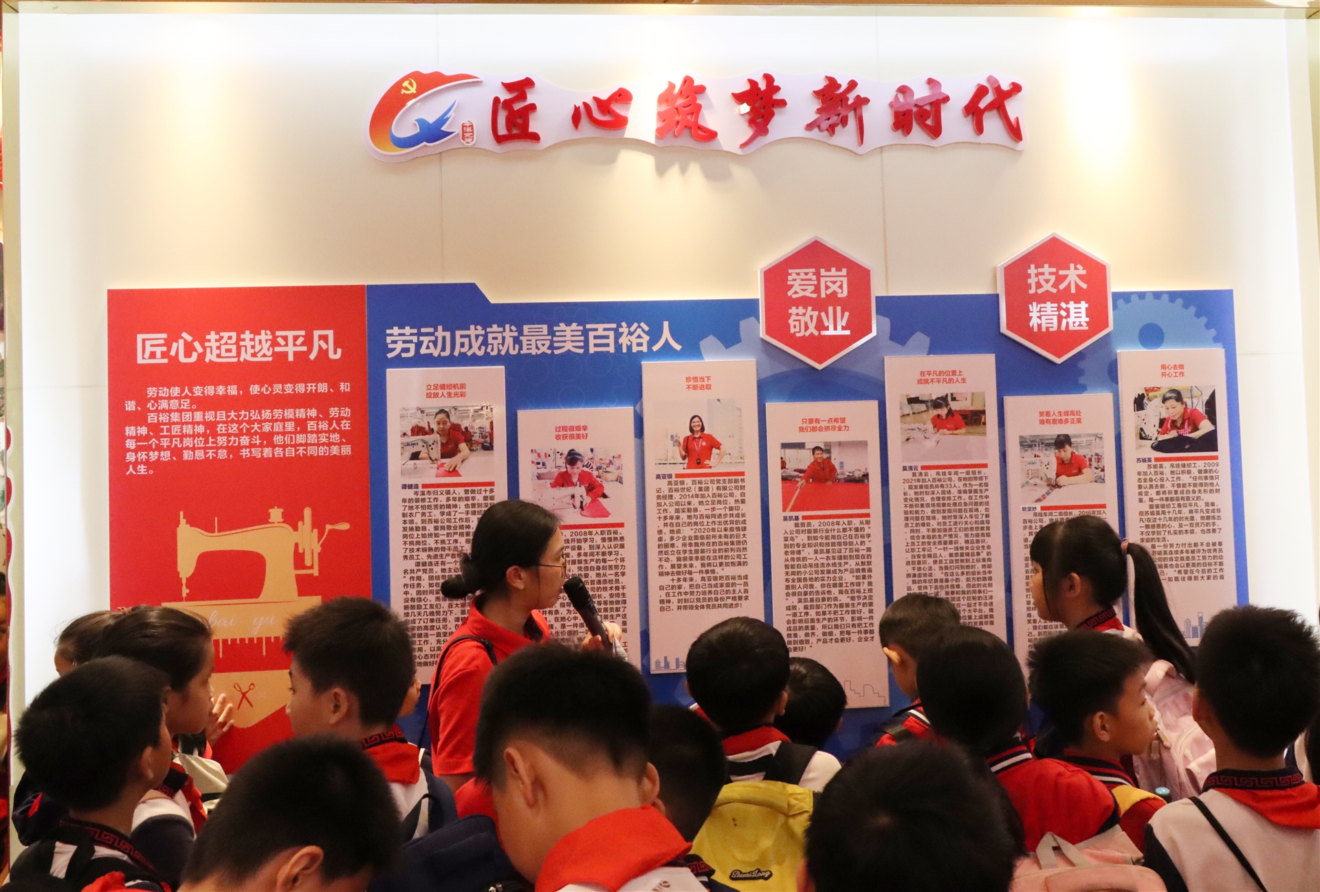 孩子們走進(jìn)了百裕集團(tuán)黨建中心,了解到了百裕集團(tuán)的發(fā)展歷程、取得的成績及榮譽(yù)。接著還到“五一勞動獎?wù)隆?、技能大賽一等獎和“身邊最美黨員”稱號獲得者的相關(guān)工位,聆聽了他們的故事,學(xué)習(xí)到了偉大的工匠精神。