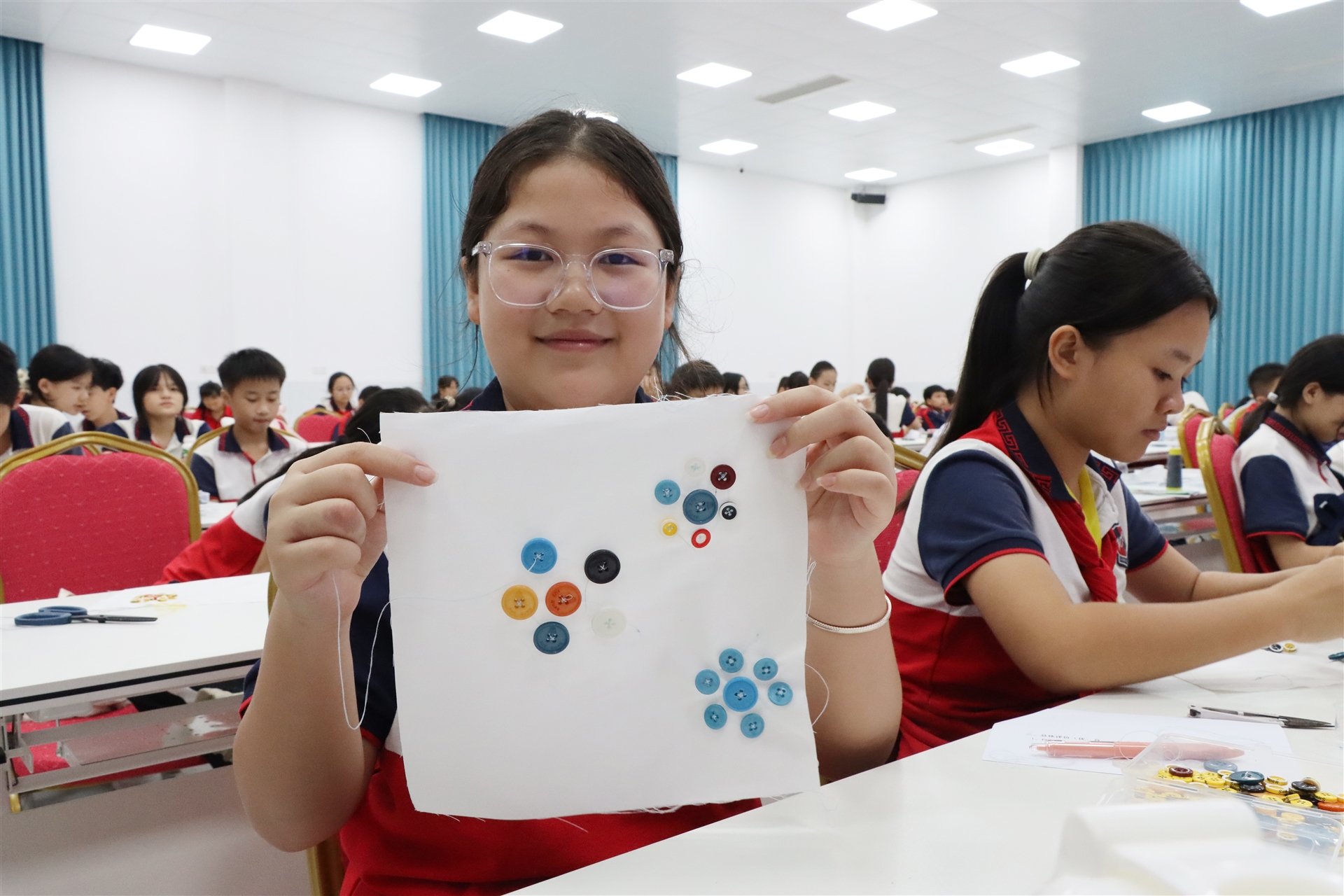 孩子們還體驗(yàn)了一場別開生面的服飾小制作,領(lǐng)略了制作之美。在老師的指導(dǎo)下,學(xué)生們首先了解紐扣的基本構(gòu)造和縫制紐扣的步驟要領(lǐng),之后再自己動手做“針線活”,用略顯稚嫩的小手把扣子穿牢固定,還發(fā)揮了自己的想象力,把不同的扣子組合拼接,形成一幅幅生動的花朵“畫作”。