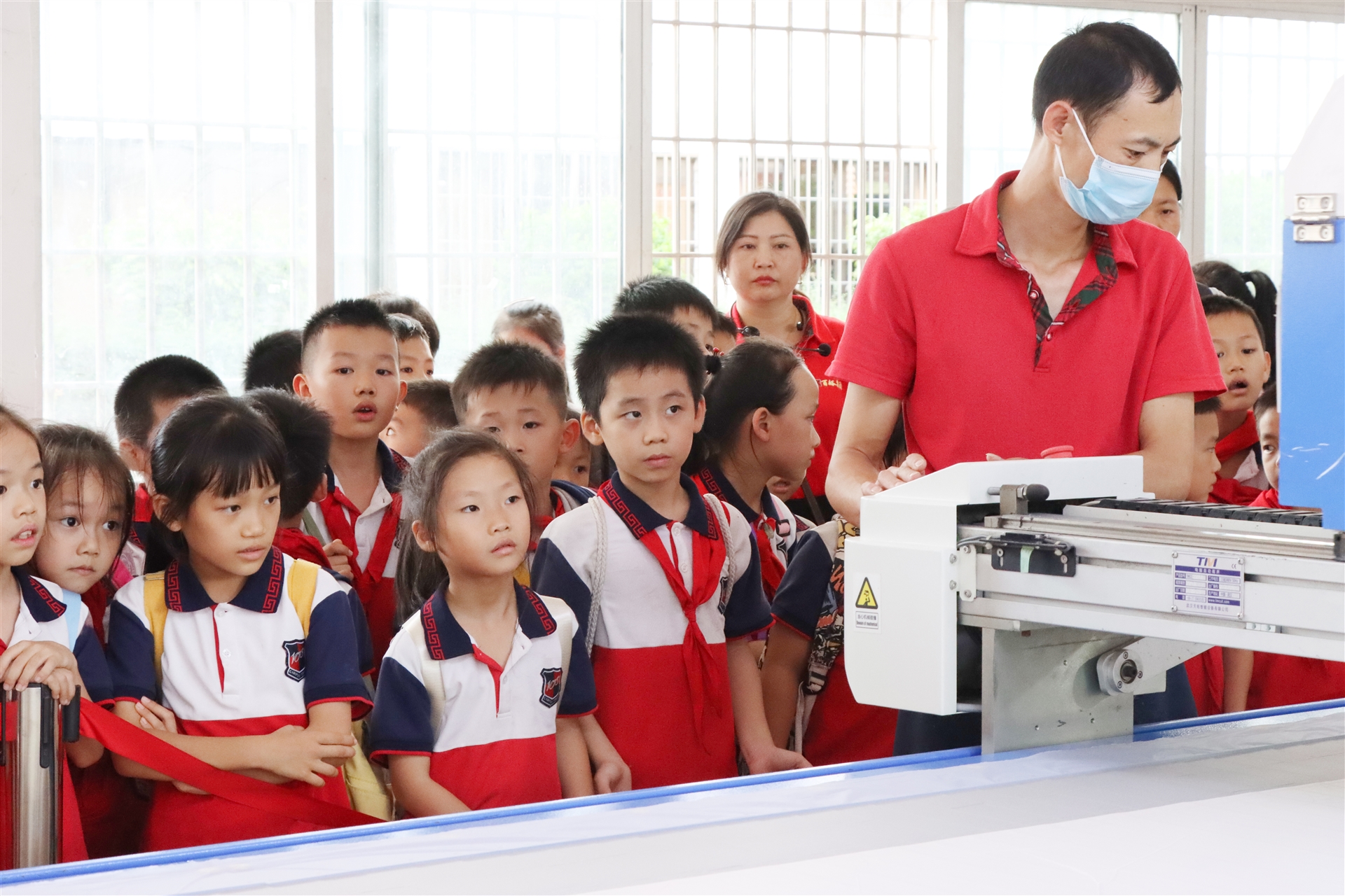 走進(jìn)百裕服裝的生產(chǎn)車間,孩子們興奮的到處張望,寬大整潔的車間里擺放著一臺臺先進(jìn)的生產(chǎn)設(shè)備,工人們正在制作生產(chǎn)。在講解員的引領(lǐng)下,帶著孩子們了解校服制作的流程和生產(chǎn)工藝,直觀的感受校服是如何生產(chǎn)的。