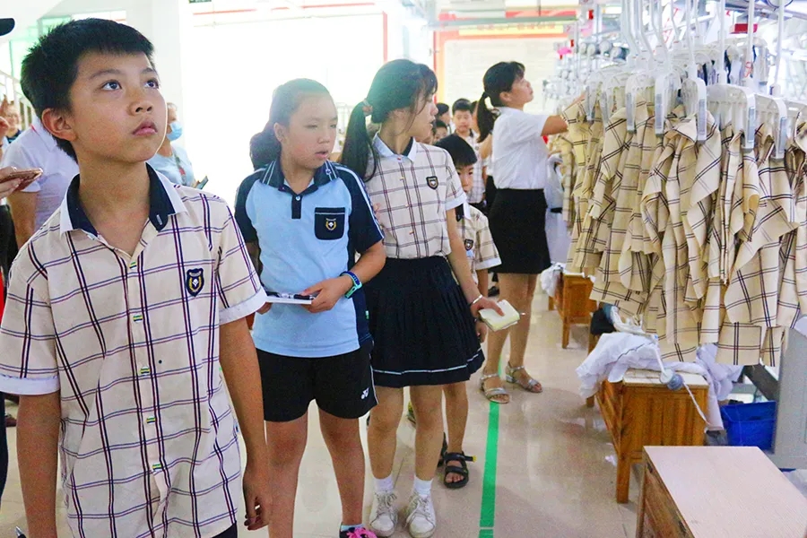 小記者們?cè)谏a(chǎn)中心工作人員的引領(lǐng)下,先后參觀了黨建中心、吊掛車間、裁剪車間、線下針織車間、全國(guó)學(xué)生裝文化展示中心、企業(yè)展示中心等。小記者們圍著解說(shuō)員爭(zhēng)先恐后地提問(wèn),認(rèn)真地聆聽講解、仔細(xì)地觀察、記錄。解說(shuō)員耐心地向小記者們?cè)敿?xì)介紹服裝的每一道工序,小記者們第一次這么近距離接近服裝生產(chǎn)線,一雙雙好奇的眼睛滿是欣喜,親眼見證了一件學(xué)生裝各個(gè)環(huán)節(jié)生產(chǎn)的過(guò)程,了解全國(guó)各地一些學(xué)生裝文件知識(shí)。