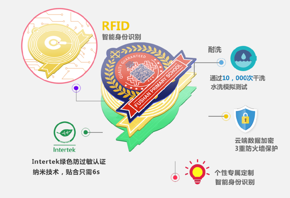 這兩塊標(biāo)識分別是RFID智能傳感芯片和智能二維碼?;?它們有效提升了校服的科技感。