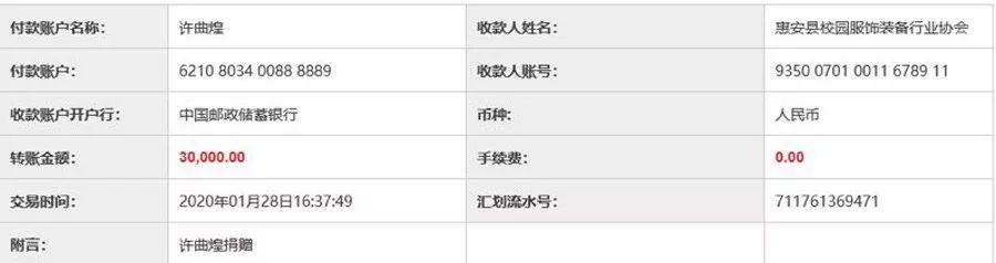 許曲煌董事長作為惠安校園服飾裝備行業(yè)協(xié)會會長,牽頭組織惠安校服協(xié)會共有132名會員企業(yè)家、群友,通過協(xié)會賬戶主渠道捐資520500元,通過其他渠道捐款的數(shù)額也將近20萬元。協(xié)會所募抗疫捐資,已轉40萬元到惠安縣慈善總會戶頭。其余的,根據(jù)有關部門意見,留待購買應急防控醫(yī)用物品,或隨時聽候縣防控指揮部調(diào)用。目前,后續(xù)的捐款還在進行中。